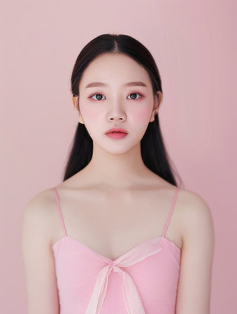 Asian woman in pink dress posing for photo on pink background, beauty and fashion concept