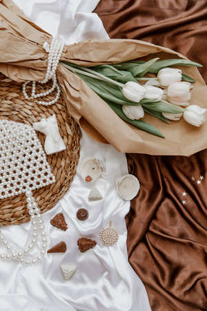 White tulips on silky background, Greeting card for Valentine \ 's Day or Mother \' s Day. Stylish blogger flat lay, fashion