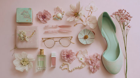 Feminine flat lay with women fashion accessories, jewelry, cosmetics, coffee and flowers.