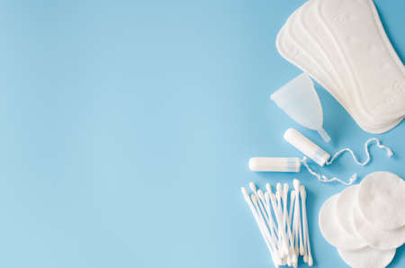 Women's hygiene related obljects on a blue background.