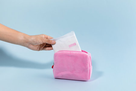 Menstrual tampons and pads in cosmetic bag. Menstruation cycle. Hygiene and protection.
