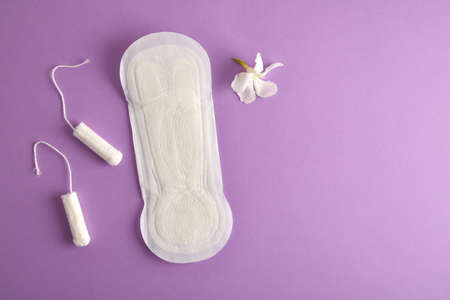 Female menstrual protection with tampon and cotton pad and white flower on lilac background. Top view.