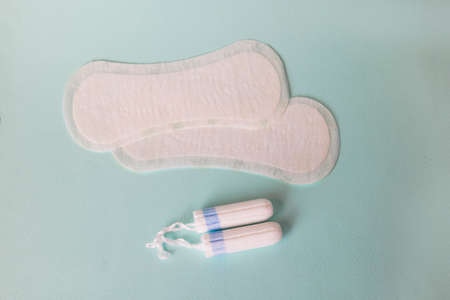 The concept of protection during menstruation. Panty liners and tampons on a blue background. Copy space
