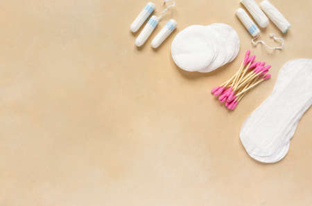 Cotton pads, ear sticks and menstrual tampons on beige background. Space for text
