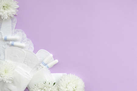 Menstrual pads and tampons with tender white flowers on pastel lilac background. Woman critical days, gynecological menstruation cycle period. Sanitary woman hygiene. Flat lay with copy space