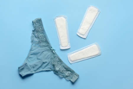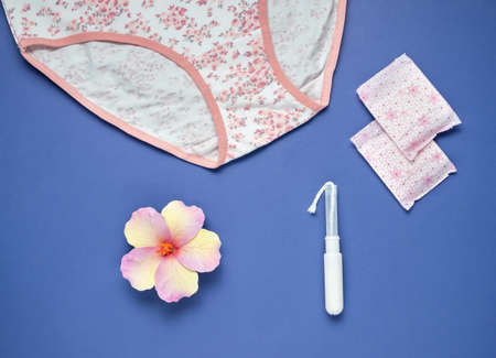 Womens underwear and intimate hygiene products. Concept of menstruation, womans health, menstrual cycle, virginity, critical days, hygiene protection, pain, premenstrual syndrome. Top view, flatly