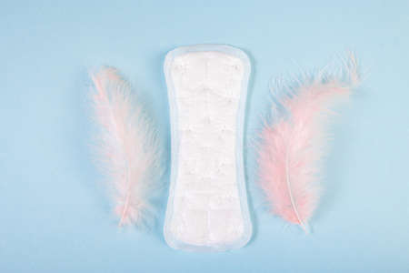 Sanitary pad and feather on blue background. Feminine menstrual hygiene products. Womens health concept.