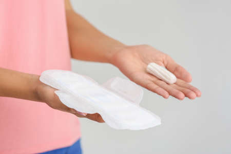 Woman holding menstrual pad and tampon on light background, closeup