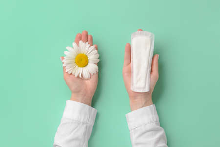 Female hands with menstrual pad and chamomile flower on green background