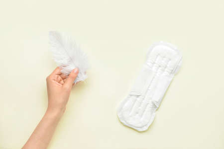 Female hand with feather and menstrual pad on yellow background