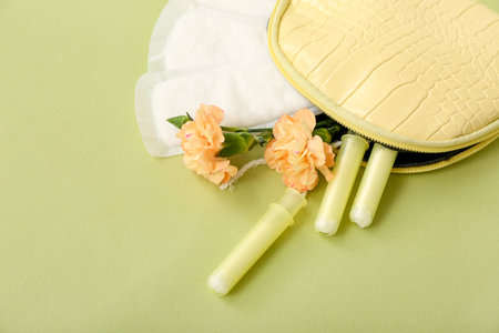 Lady's cosmetic bag with tampons, menstrual pads and flowers on olive background