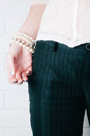 stylish fashion look in detail, woman's neck with pearls and gold chain, white tank top, unbuttoned shirt collar, handing blue glasses, bag in hand, blue jacket slung over her shoulder