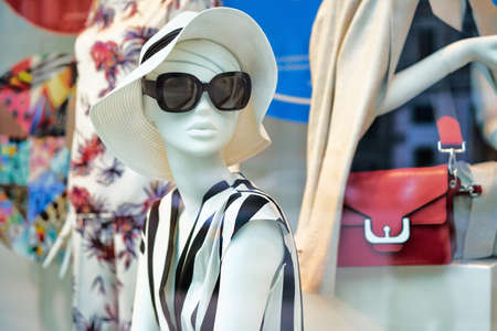 Vogue modern young girl with bag in glasses in stylish clothes and beautiful white straw hat poses near gray wall outdoors. beauty lady on the street. Elegant summer look.