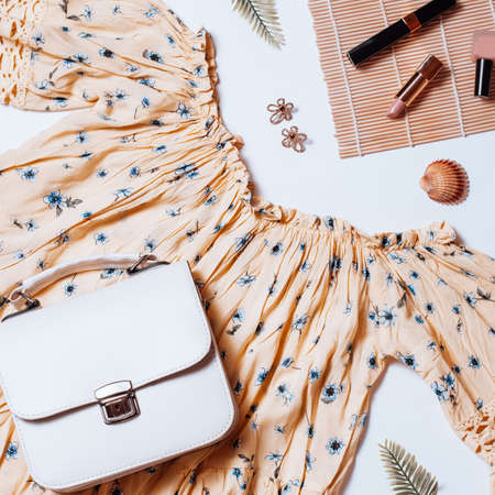 Fashion female clothes and accessories for beach destinations or summer vacation. Flat lay with woman white clothing and purse, make up items on terracota background, woman travel fashion concept