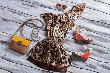 Leopard dress with bicolor purse. Aviator sunglasses and colorful bracelets. New items on showcase. Low prices for designer clothes.