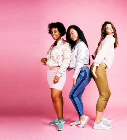 different nation girls with diversuty in skin, hair. Asian, scandinavian, african american cheerful emotional posing on pink background, woman day celebration, lifestyle people concept