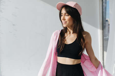 brunette armenian woman in cap looking away near white wall with shadows, banner