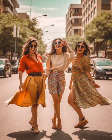 Generative AI : Three young diverse women having fun on city street outdoors Multicultural female friends enjoying a holiday day out together Happy lifestyle youth and young fema