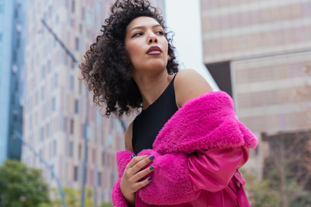 Elegant dancer in a pink coat performing artistic movements in an urban setting