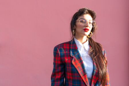 Waist up portrait of the young attractive brunette femalee in glasses, with red lips, dressed in plaid jacket and white shirt, isolated over pink background