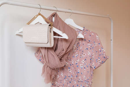 Girls fashion background, brown dress, trendy straw bag and bracelets on pastel pink, flat lay, top view, sopy space, selective focus