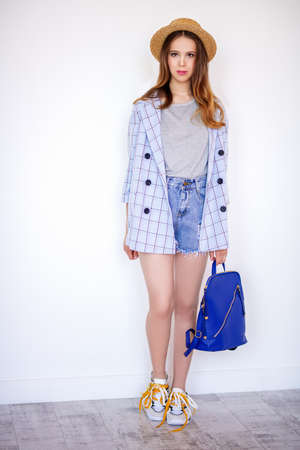 A full length portrait of a stylish bright fashionable happy girl posing in the studio over the light blue background. Summer casual fashion.