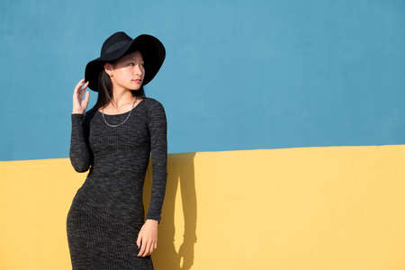 fashionable oriental young woman posing in a black tight dress and hat on a colorful yellow and blue background, concept of fashion and lifestyle, copyspace for text