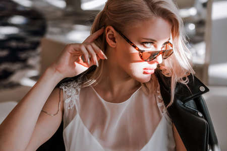 Beautiful blonde young bride woman in white wedding dress, black leather jacket and sunglasses.