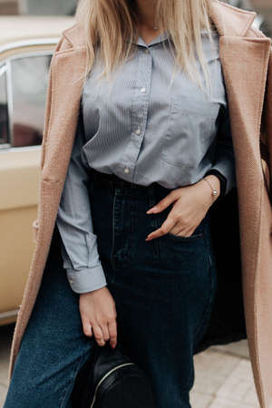 Girl model in fashionable clothes with a vintage beige sweater, jacket, leather belt and classic blue jeans. Female casual winter style
