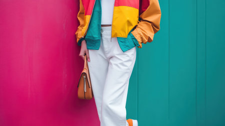 Spring style shines with a color-block jacket, paired with white chinos and bright sneakers. The look is accentuated by a chic leather crossbody bag against a colorful backdrop.