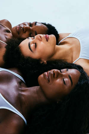 group of multiethnic women with different kind of skin posing together in studio. Concept about body positivity and self acceptance