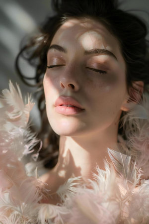 Closeup of a serene face surrounded by soft pink tulle and gentle floral elements