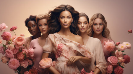 Diverse group of confident women standing side by side, showcasing different beauty and ethnic backgrounds. Unity and empowerment concept.