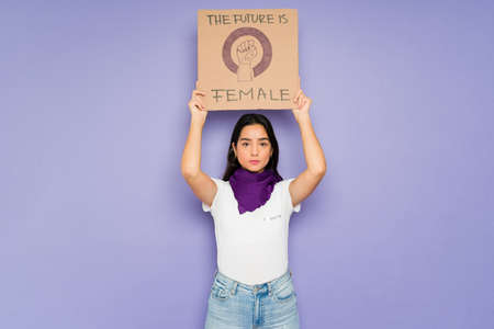 Feminist hispanic woman holding a protest sign with the future is female message during a march for equality