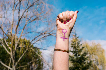 Fist of an older woman with purple painted nails, with the sky in the background, with the female symbol painted. Concept of women's day, empowerment, equality, inequality, activism and protest.