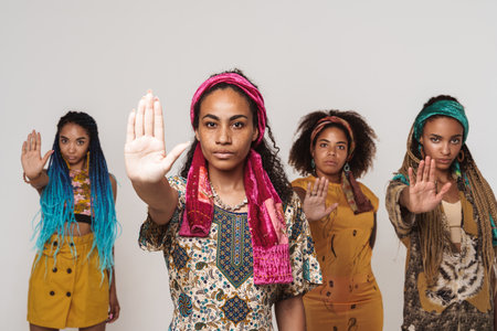 Young black four women wearing dress showing stop gesture at camera isolated over white background