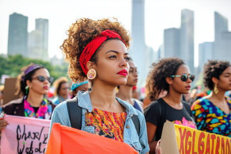 Group of activists gathered in the city center, passionately holding posters advocating for women's rights; the demonstration fosters awareness and unity among participants.