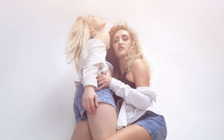 Two girls spend time tenderly together on a walk. Love and attitude. LGBT concept