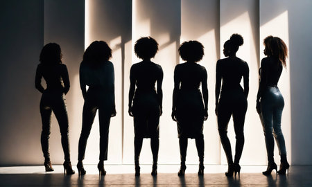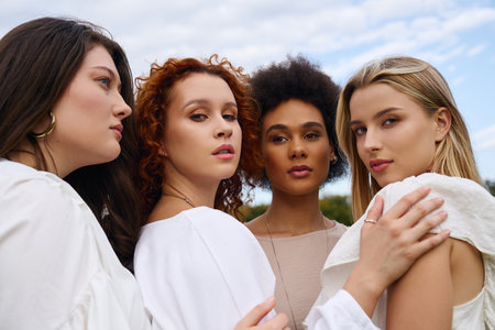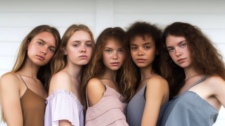 Diverse group of confident women standing side by side, showcasing different beauty and ethnic backgrounds. Unity and empowerment concept.