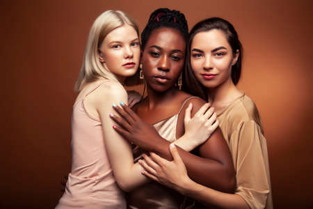 young pretty asian, caucasian, afro woman posing cheerful together on brown background, lifestyle diverse nationality people concept