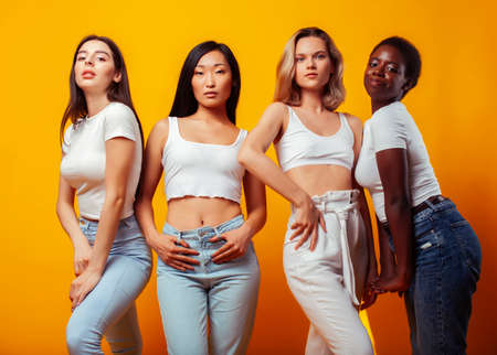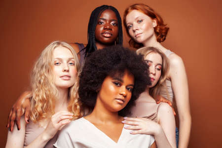 group of multiethnic women with different kind of skin posing together in studio. Concept about body positivity and self acceptance
