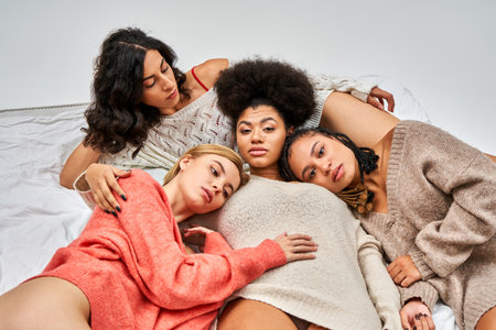 High angle view of multiethnic women in stylish warm jumpers looking at camera while lying on bed isolated on grey, different body types and self-acceptance, multicultural representation