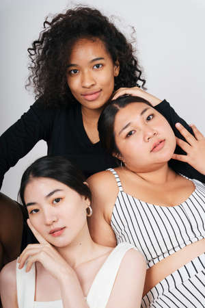 Group of multiethnic women with different kind of skin posing together in studio. Concept about body positivity and self acceptance