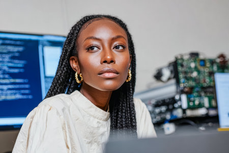 A woman sits at a desk in an office filled with computers and circuit boards. She looks serious as she focuses on her work with coding and technology in front of her.
