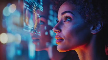 Young Professional woman Engaging with Computer Technology in Modern Workspace. innovative technology concept in blue ambient light