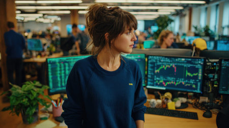 Financial analyst working on multiple monitors displaying stock market charts, financial data, and trading analytics. Intense trading environment for investment, finance, and technology