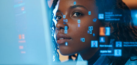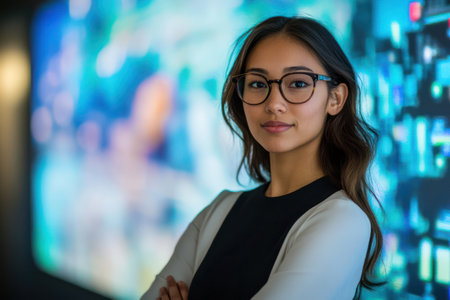 A confident woman with glasses stands before a digital interface, symbolizing intelligence, leadership, and tech expertise.