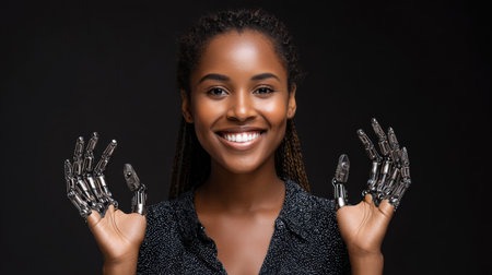 Beautiful smiling dark-skinned girl with robot hands on a dark background, transplant. Artificial Intelligence, Futuristic Digital Technology, Metaverse of Digital Intelligent World.