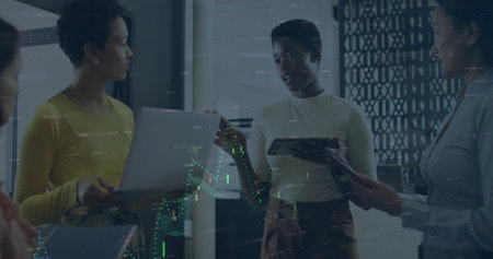 Image of data processing over diverse business people in office. Global business and digital interface concept digitally generated image.