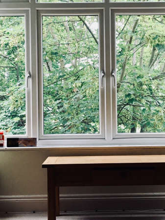 Fall, autumn season. Trees with yellow leaves out of two closed white wooden windows